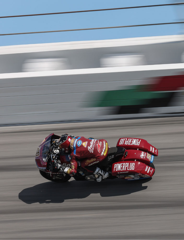 En 1909, nous avons remporté la première course de motos organisée à l'Indianapolis Motor Speedway. En 1937, Ed Kretz a remporté la première édition du Daytona 200 sur une Indian Sport Scout. Le Wrecking Crew original a dominé la scène des courses d'après-guerre. Nous avons perpétué cette tradition avec les courses de flat track dans les années 2010. Les pilotes d'aujourd'hui font de même dans la Bagger Racing League Europe et la série MotoAmerica King of The Baggers. Des époques différentes. Le même résultat.